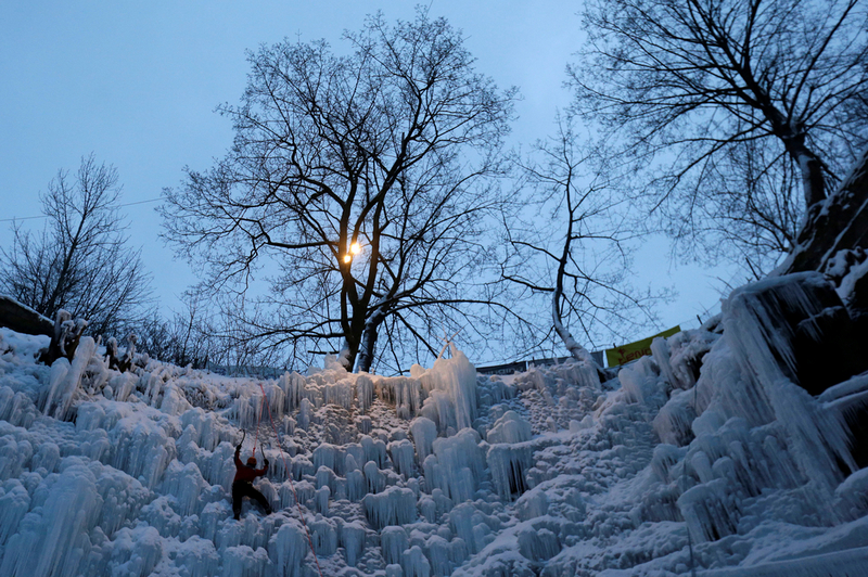 当地时间2017年1月12日,捷克利贝雷茨,一名男子爬上人工冰墙。