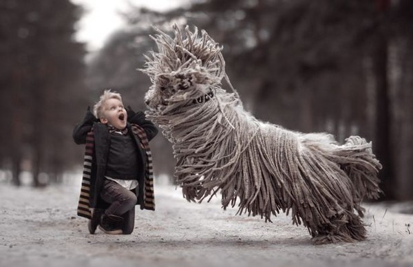 一只宠物狗跟4岁的小男孩在雪地中嬉戏。狗狗凌空跃起的一幕,像极了一支飞跃在空中的拖把。该狗狗的名字叫“宙斯”(Zeus),品种是匈牙利牧羊犬,又称“可蒙犬”(Komondor)、“拖把犬”。