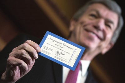 图片说明: 美国华盛顿,共和党参议员罗伊·布朗特出席新闻发布会,展示候任总统特朗普就职典礼的入场券。 东方IC