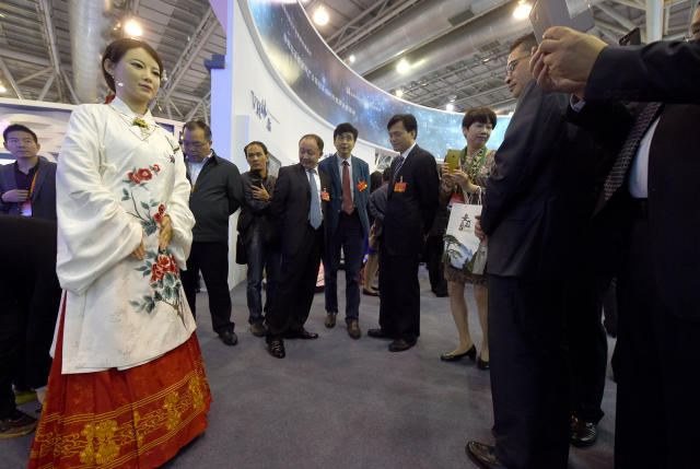2016年10月18日,由中国科学技术大学研制的智能机器人“佳佳”在2016中国国际徽商大会上与嘉宾互动。(新华社记者郭晨摄)