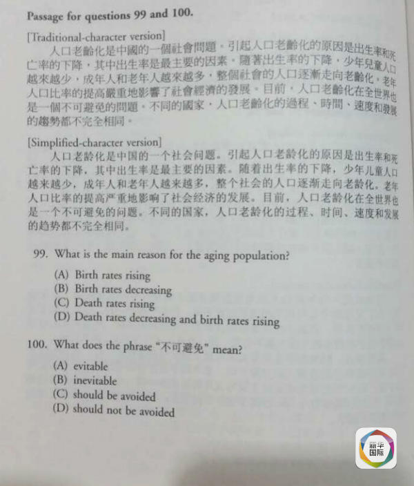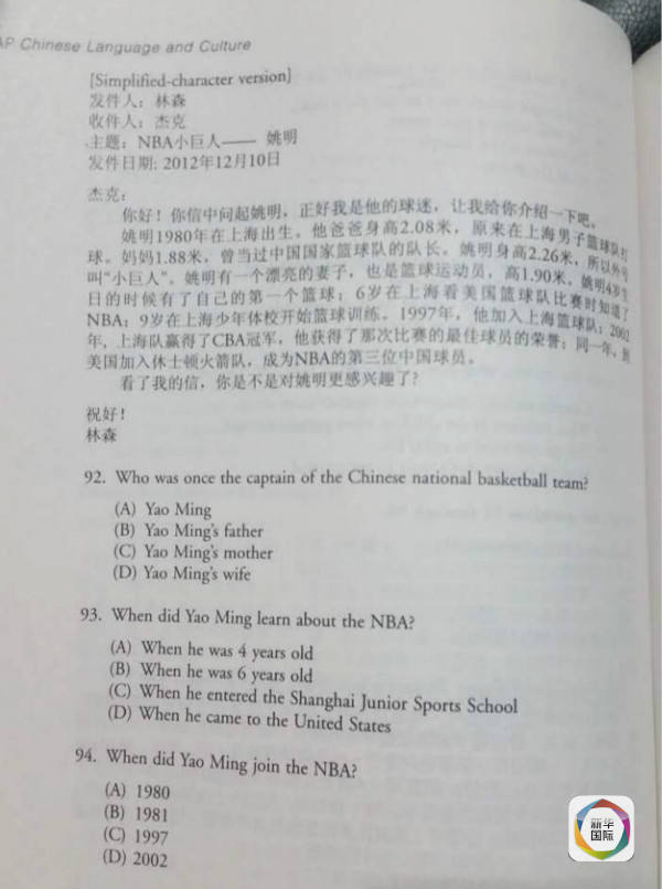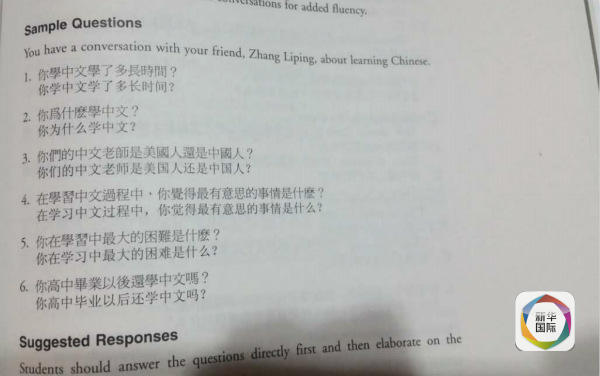 相比之下,“AP”课程中文考试比前者更难。题型分为听力、阅读理解、写作、口语。