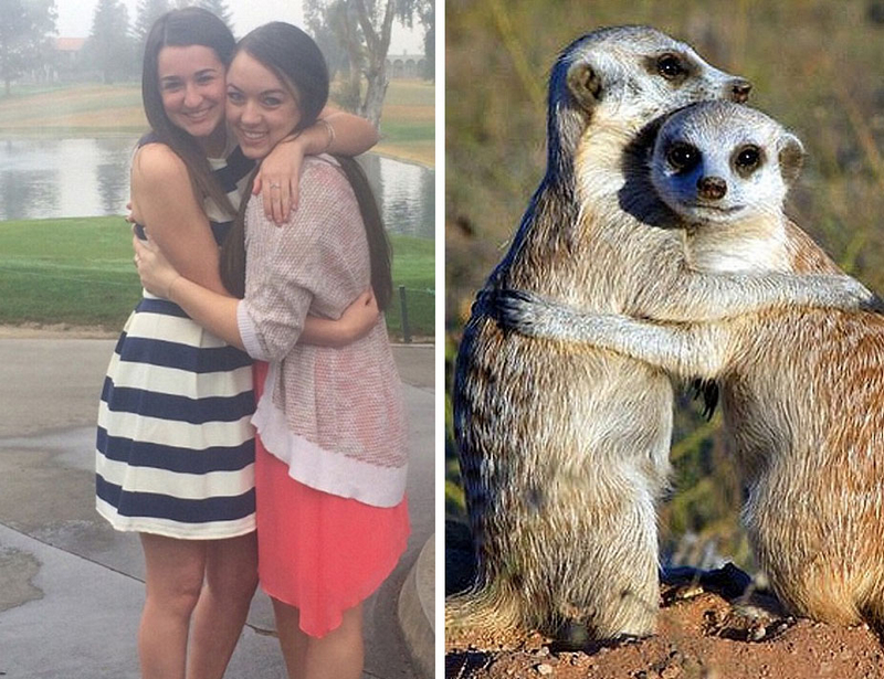 照片中,有时候女孩们把头凑在一起嘟嘴卖萌,与其相似的照片中,一群猫鼬也头挨着头,瞪着大眼睛;有时候女孩们又一个接一个地站好,微笑着看向镜头,而在类似的照片中,小猫鼬们也前后紧紧偎依着,目不转睛地盯着前方。