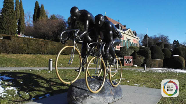 洛桑奥林匹克博物馆公园对面湖边便道上的雕塑。新华社记者高鹏摄