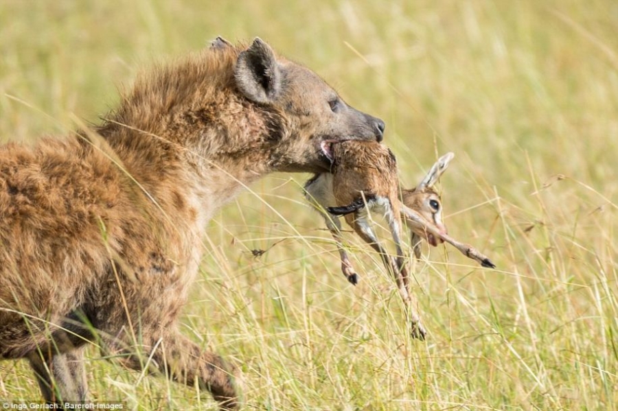 这张图片很残忍,刚出生的小羚羊,被鬣狗捕获了。