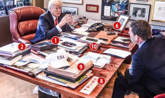1. 由高盛集团前总裁约翰·桑顿(John Thornton)所撰写的小说《美丽国度》(Beautiful Country),故事内容讲述一个14岁美国网球选手来到中国受训,并从这位少年的眼睛看中国的世界。2. 两本美国有线电视新闻网(CNN)为特朗普当选出的专书。8. 特朗普在竞选时所用的贴纸“让美国更美好”。9. 数份《金融时报》。 10. 美国《时代》杂志在去年度封特朗普为年度人物的数份杂志。