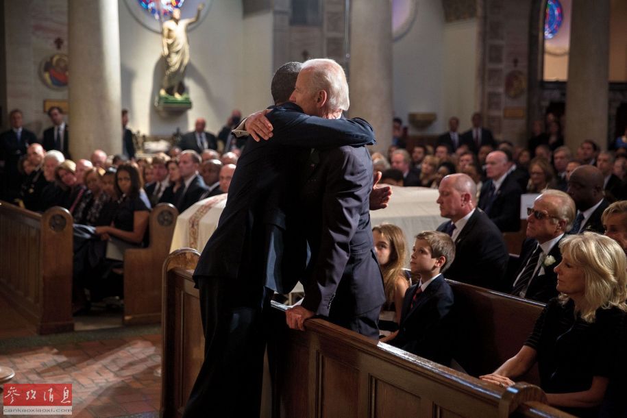 2015年6月6日:在拜登副总统儿子的葬礼仪式上,奥巴马慰问拜登。