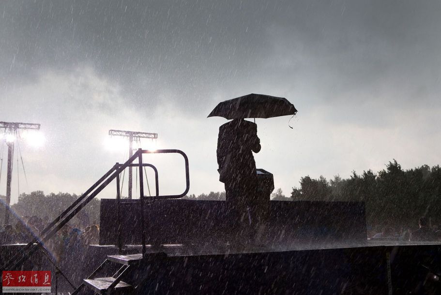 2010年5月31日:阵亡战士纪念日的露天讲演因暴风雨取消,奥巴马依旧持伞登上讲台。