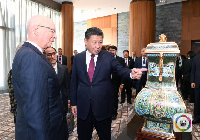 1月17日,国家主席习近平在瑞士达沃斯会见世界经济论坛主席施瓦布。这是习近平向施瓦布介绍中华人民共和国赠送给世界经济论坛的四面方尊。(新华社记者 饶爱民 摄)