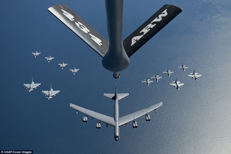 2016年6月9日,波罗的海上空,由一架美国空军B-52“同温层堡垒”亚音速远程战略轰炸机领衔的飞机编队。队伍中还有两架波兰空军F-16战隼,4架美国空军F-16战隼,两架德国“欧洲台风”战斗机,还有4架瑞典“鹰狮”战斗机。