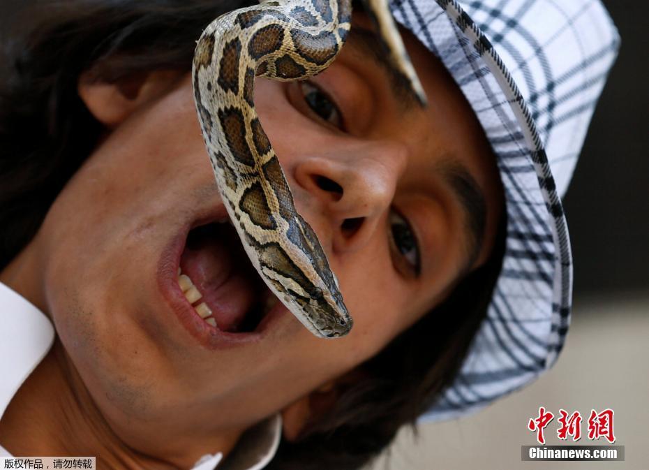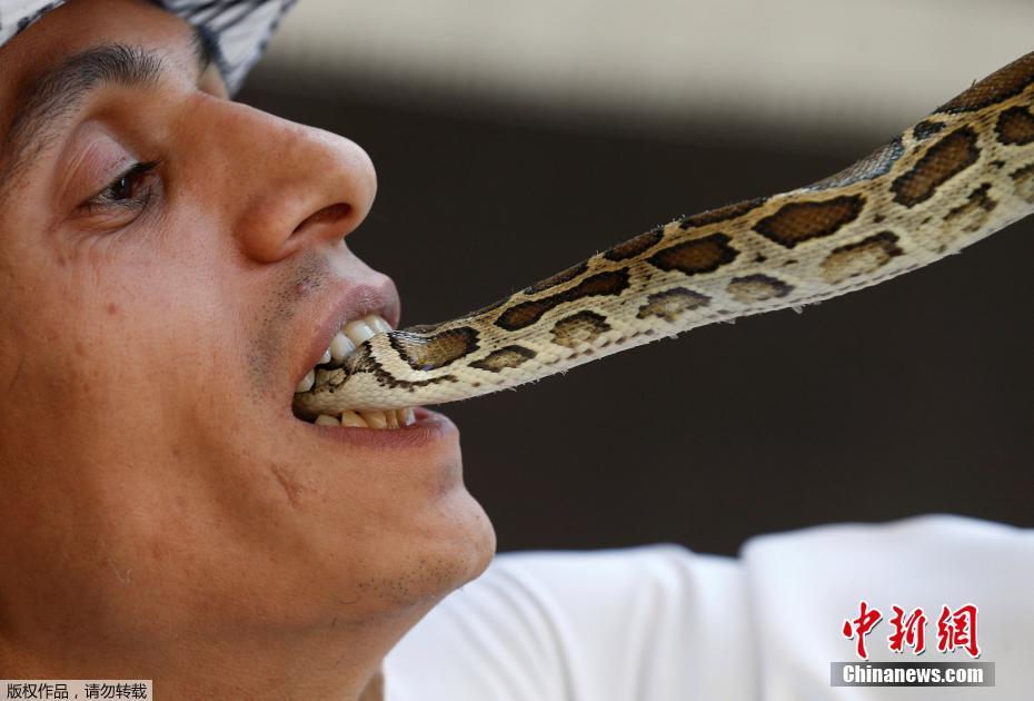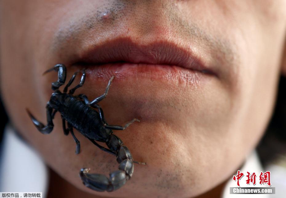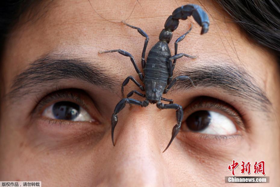 当地时间1月17日,沙特利雅得,一名巴勒斯坦男子Nabeel Mussa任由他养的蝎子在自己脸上爬。Nabeel Mussa喜欢养蛇与蝎子,并将它们当作食物吃掉。