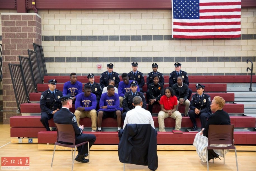 2015年5月18日:在对警察暴力执法怨声载道的时刻,奥巴马与费城郊区一所城镇的警察和实习生进行交流。