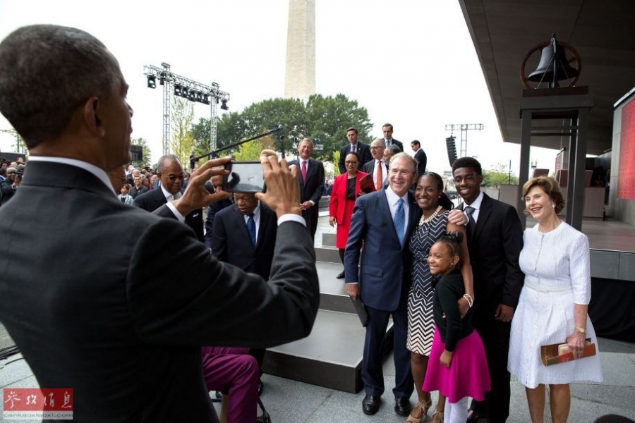 2016年9月24日:在一个非洲-美国历史文化博物馆的揭幕仪式间隙,奥巴马应邀为小布什夫妇拍照。