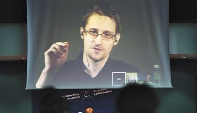 2015年6月23日,美国中情局前雇员爱德华·斯诺登通过视频参与一个听证会。2013年泄露美国国安局的监听计划后,斯诺登藏身俄罗斯至今。 图/视觉中国