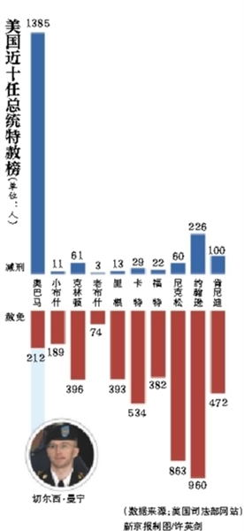 在即将离开白宫之际,奥巴马再次行使了美国总统的特赦权:赦免64人、为209人减刑。这些获得奥巴马“恩赐”的人中包括曾将大量机密资料泄露给维基揭秘的原军方情报分析员切尔西·曼宁。这一减刑引发争议,共和党方面尤其表示强烈不满。