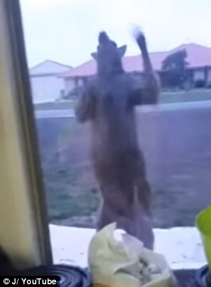 就在几天前,墨尔本的一位女子在慢跑时遭巨型袋鼠攻击,她及时装死才逃过一劫。图为袋鼠正在挠玻璃。