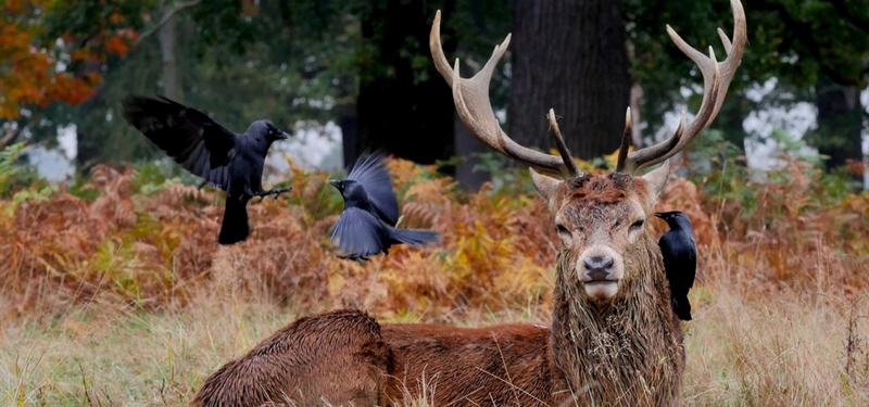 金秋时节,在矮树丛中休憩的一只鹿,身边是渡鸦在嬉戏打闹。摄影师利亚姆 汤姆森感概:“如果入镜的只有此鹿,画面也足够令人心醉。但如果再多点耐心,细细一看,欢快的鸟儿和淡然的小鹿形成鲜明的对比。如此画面着实令人心生欢喜。”