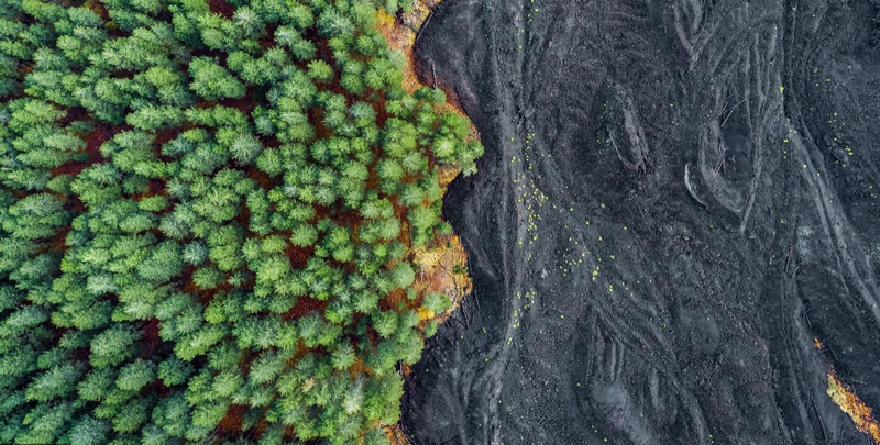 无人机拍摄的熔岩河,与西西里岛的森林接壤。