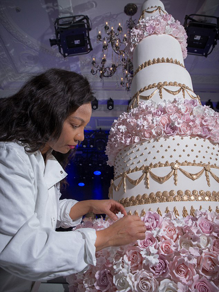 据悉,蛋糕设计师伊丽莎白·苏拉瑞(Elizabeth Solaru)所使用的定制糖霜是用私人飞机从世界各地空运来的,耗费了1000多个鸭蛋。该蛋糕有香槟草莓、奶油蜜桃、西西里柠檬、红丝绒和缤纷巧克力等5种口味。此款蛋糕原本有14层,代表婚礼在14日举行。由于场地空间有限,蛋糕不得已被削减至10层,高达10英尺(约3米)。