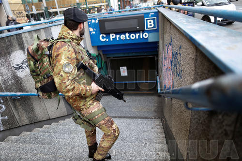 1月18日,在意大利罗马,一名士兵站在地铁站口。意大利中部地区18日上午分别发生3次5级以上地震,包括首都罗马所在的拉齐奥大区和阿布鲁佐、马尔凯大区均有震感。目前尚无人员伤亡和财产损失的报告。 ( 新华/路透)