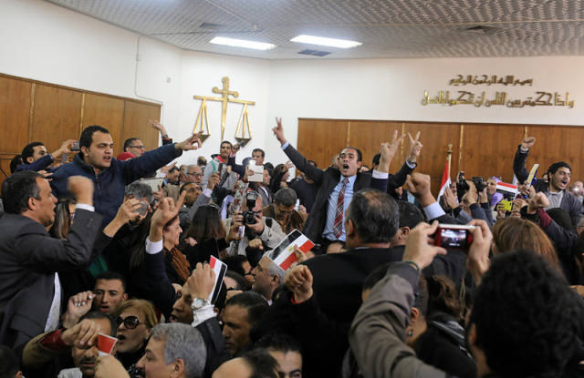 1月16日,在埃及首都开罗,人们在行政法院终审裁决“归还”沙特岛屿协议无效后欢呼庆祝。(新华社发,艾哈迈德·戈马摄)