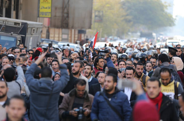 1月16日,在埃及首都开罗,民众游行抗议蒂朗、塞纳菲尔两岛“归还”沙特。(新华社发,艾哈迈德·戈马摄)