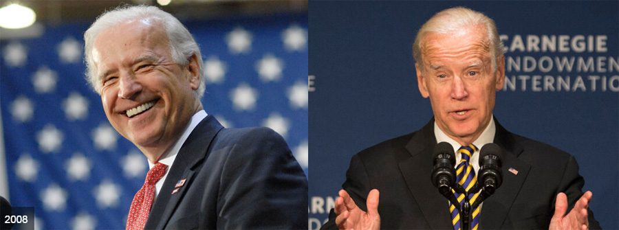 2008年的副总统乔·拜登(Joe Biden)尽管头发雪白,但脸色圆润,如今额头上皱纹重重。