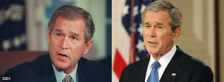 美国前总统小布什2001年与2008年卸任时的对比图。