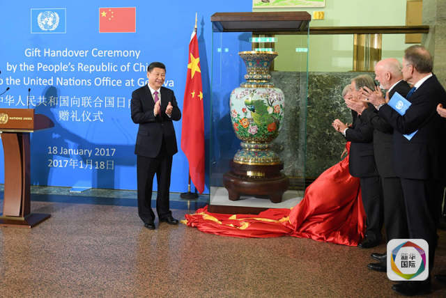 1月18日,国家主席习近平在瑞士日内瓦万国宫出席“共商共筑人类命运共同体”高级别会议,并发表题为《共同构建人类命运共同体》的主旨演讲。这是会议结束后,习近平出席中国向联合国日内瓦总部赠礼仪式。(新华社记者张铎摄)