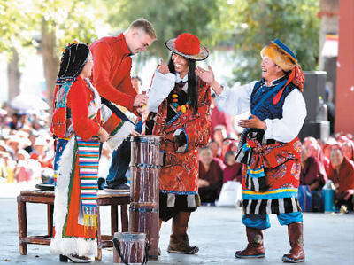 正在西藏自治区日喀则扎什伦布寺游览的外国游客被邀请参加小品表演。