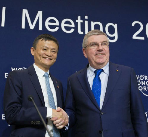 阿里巴巴成为国际奥委会全球合作伙伴。1月19日,在瑞士达沃斯,国际奥委会主席巴赫(右)与阿里巴巴集团董事局主席马云出席新闻发布会。