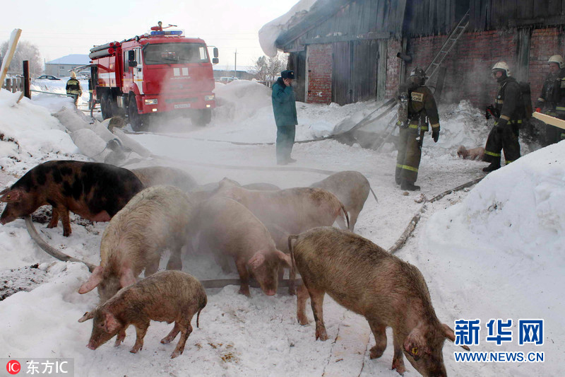 当地时间2017年1月21日,俄罗斯托木斯克,当地一私人养猪场发生火灾,消防员紧急救出近150头猪。图片来源:东方IC