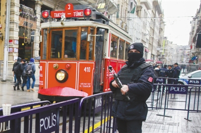 为了应对不断恶化的安全局势,土耳其政府在各地增派警力加强安保,以恢复外界对土耳其的信心。图为日前在伊斯坦布尔,一辆有轨电车从执勤的警察身旁驶过。新华社发
