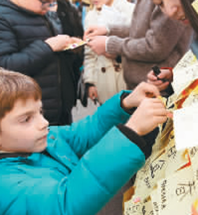 2016年1月30日,在意大利罗马中国文化庙会上,一名意大利男孩将自己用中文写的“春”字贴在展板上。新华社记者 陈益宸摄
