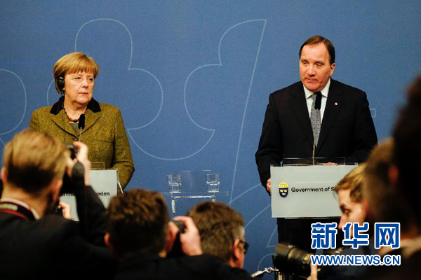 1月31日,在瑞典首都斯德哥尔摩,瑞典首相勒文(右)和德国总理默克尔出席联合新闻发布会。当日,瑞典首相勒文和德国总理默克尔批评美国的“入境禁令”。 新华社发(罗布·顺巴姆摄)