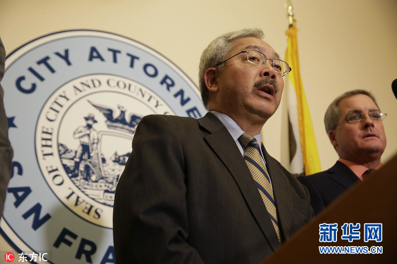 当地时间2017年1月31日,美国旧金山,旧金山华裔市长李孟贤和律师丹尼斯-赫雷拉出席记者会,就提起诉讼称总统特朗普签署行政命令削减对移民庇护城市拨款违宪回答记者提问。图片来源:东方IC