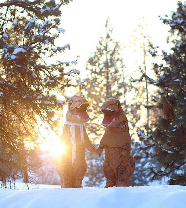 在一张照片中,两只“霸王龙”牵着手,漫步在白雪皑皑的湖岸,无比温馨;另一张照片中,他们依偎在一起,十分甜蜜;还有一张照片中,他们手舞足蹈,享受着在森林中举办的舞会,欢快又浪漫。为了将两只“恐龙”区分开,其中一只围着一条雪白的围巾。