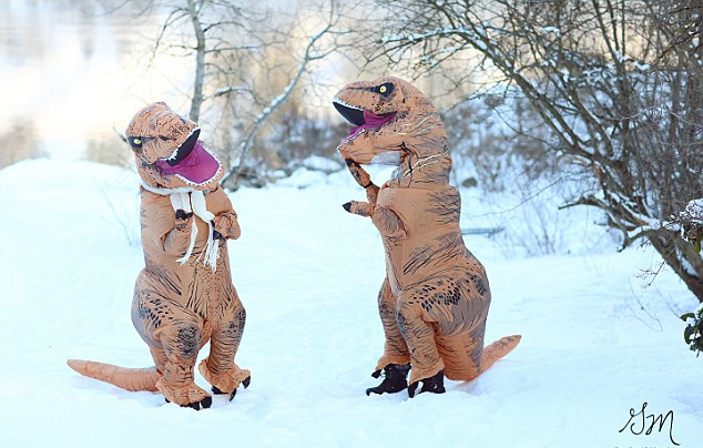 据英国《每日邮报》报道,近日,两位美国摄影师在华盛顿州斯波坎谷的一座公园拍摄了一组逗趣、温馨又感人的照片:一对假扮的夫妇穿着外形为霸王龙的服装,摆出各种亲昵的造型,场面十分有趣。