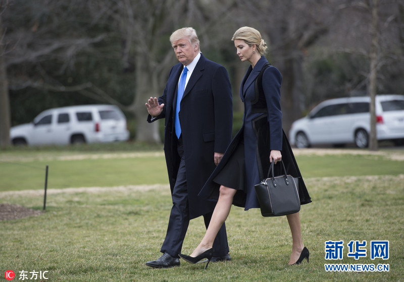 当地时间2017年2月1日,美国华盛顿,伊万卡·特朗普陪同父亲、美国总统特朗普出行,一起离开白宫。图片来源:东方IC