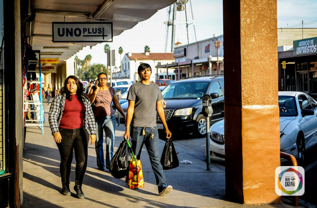 在美国加利福尼亚州卡莱克西科,墨西哥人在海关关口外的商业街购物。目前仍有大量墨西哥人跨境到美国工作、购物。边境口岸民众生活与此前无异。(新华社记者张超群摄)