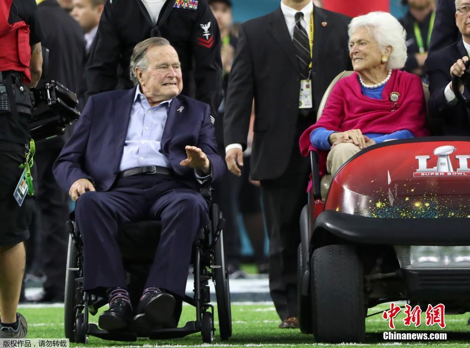 2月5日,美国国家橄榄球联盟年度冠军赛“超级碗”在休斯敦举行,美国在世最年长前总统老布什(George H. W. Bush)携妻子芭芭拉(Barbara Bush)亮相。