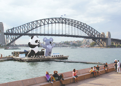 2017“中澳旅游年”吉祥物卡通大熊猫和考拉亮相悉尼港湾。本报记者 鲍 捷摄