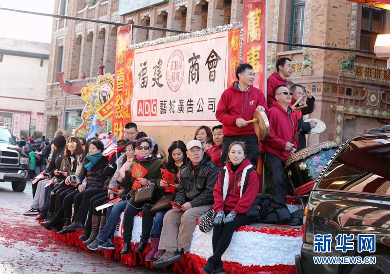 福建商会的花车队伍参加唐人街中国春节游行。当地时间2月5日,芝加哥唐人街举行新春大游行,庆祝中国农历新年。 据组织方介绍,共有14辆花车、22支游行队伍、8个舞龙舞狮队参加当天的游行,吸引数万当地民众前来观看。新华网记者 汪平 摄