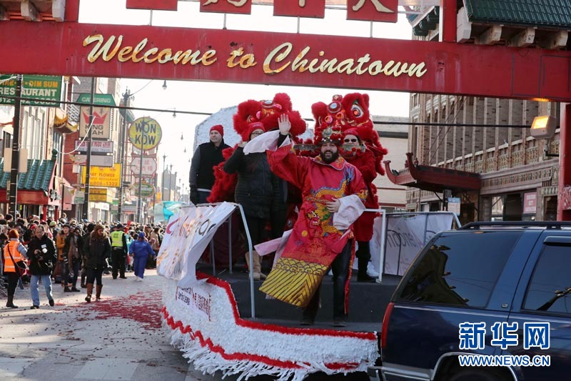 芝加哥华人咨询服务处的花车队伍参加唐人街中国春节游行。当地时间2月5日,芝加哥唐人街举行新春大游行,庆祝中国农历新年。 据组织方介绍,共有14辆花车、22支游行队伍、8个舞龙舞狮队参加当天的游行,吸引数万当地民众前来观看。新华网记者 汪平 摄