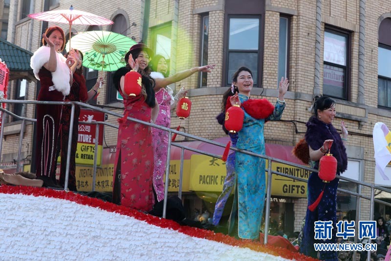 当地华人组织的花车队伍参加唐人街中国春节游行。当地时间2月5日,芝加哥唐人街举行新春大游行,庆祝中国农历新年。 据组织方介绍,共有14辆花车、22支游行队伍、8个舞龙舞狮队参加当天的游行,吸引数万当地民众前来观看。新华网记者 汪平 摄