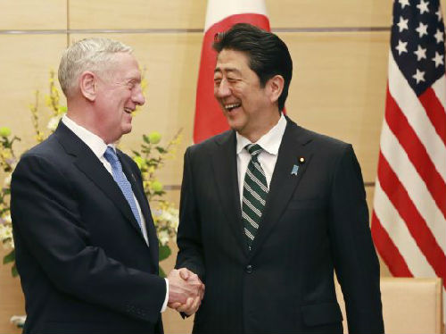 2月3日,在日本东京,日本首相安倍晋三(右)与到访的美国国防部长马蒂斯举行会谈。
