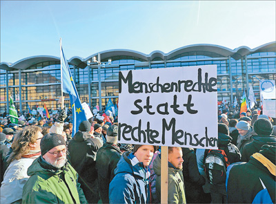 慕尼黑安全会议基金会发布的报告指出,当今世界面临的挑战之一是西方世界民粹主义和反全球化主义盛行。图为1月,德国科布伦茨民众示威抗议右翼党派集会。