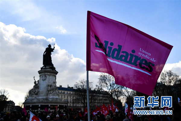 2月18日,在法国巴黎共和国广场,一名示威者高举写有“团结”字样的旗帜。法国首都巴黎和尼斯、南特等多个城市日前爆发示威游行,以抗议警察暴力执法。 新华社记者陈益宸摄