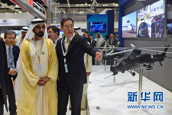 2月19日,在阿联酋首都阿布扎比,阿联酋副总统兼总理、迪拜酋长穆罕默德·本·拉希德·阿勒马克图姆(前左)参观中国防务展区。新华社记者赵丁喆摄