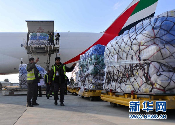 入冬以来,阿富汗多地遭遇雪灾,许多灾民生活困难。此次中国政府捐赠的帐篷、棉被和羽绒服等人道主义物资分两架次飞机运输,第二架飞机将于25日抵达。