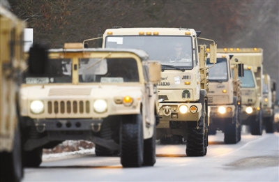 图为1月11日,在德国东北部的布吕克附近,美军车辆在路上行进。新华社发
